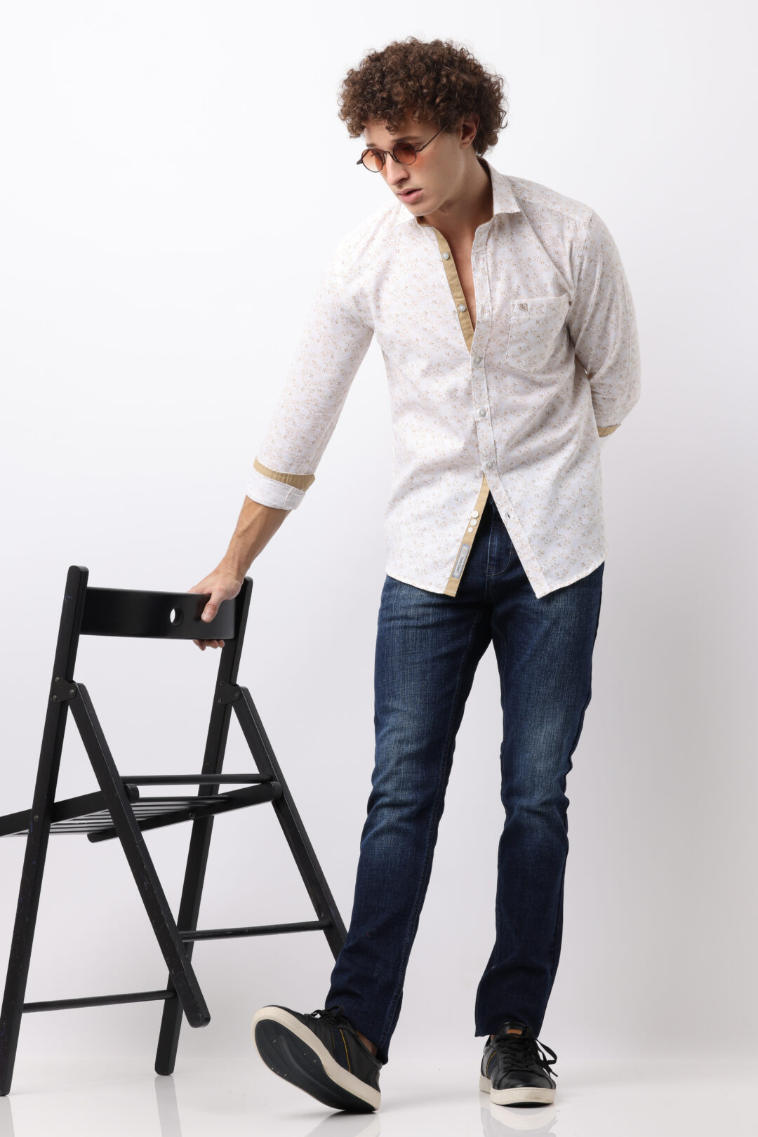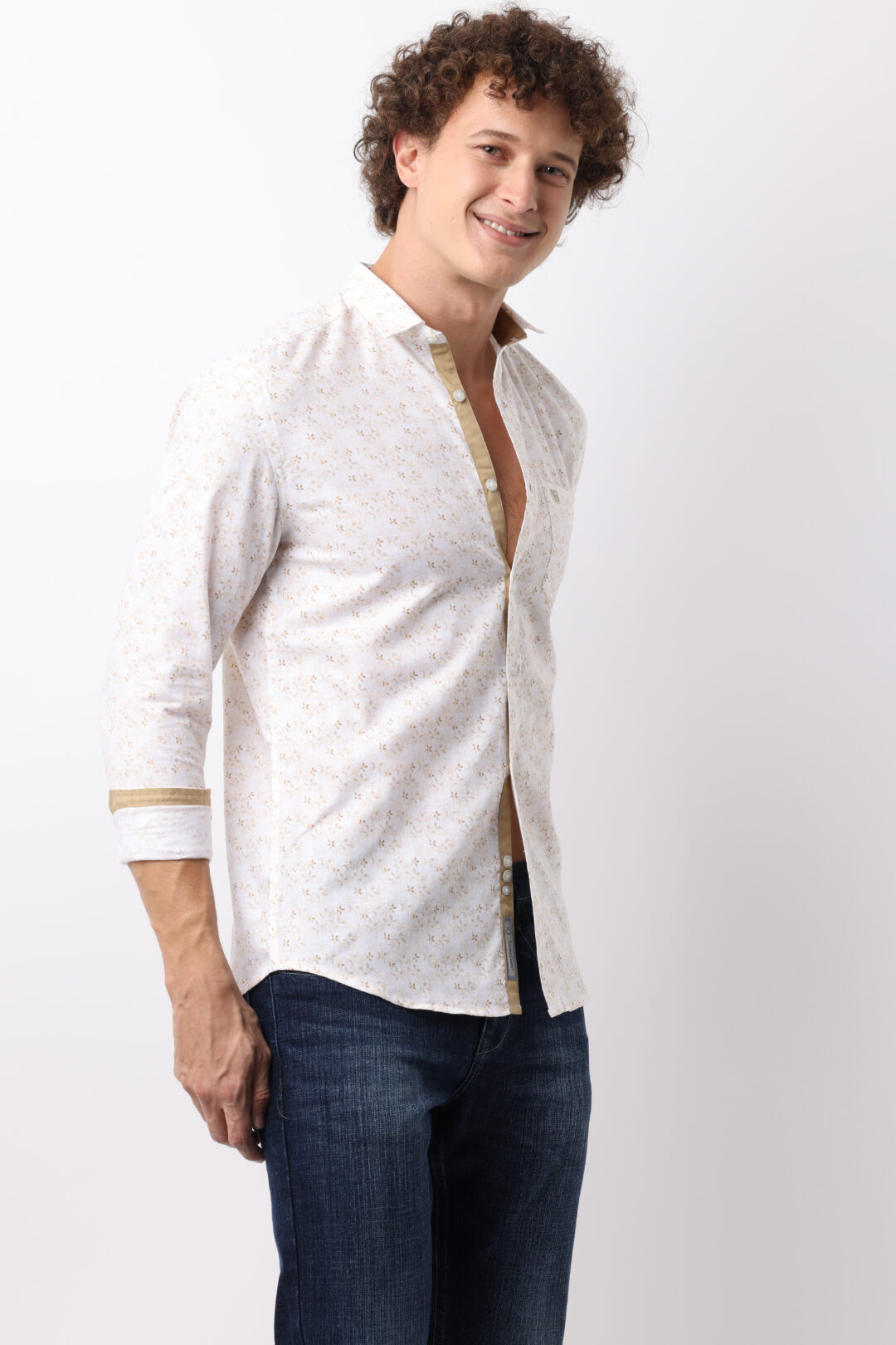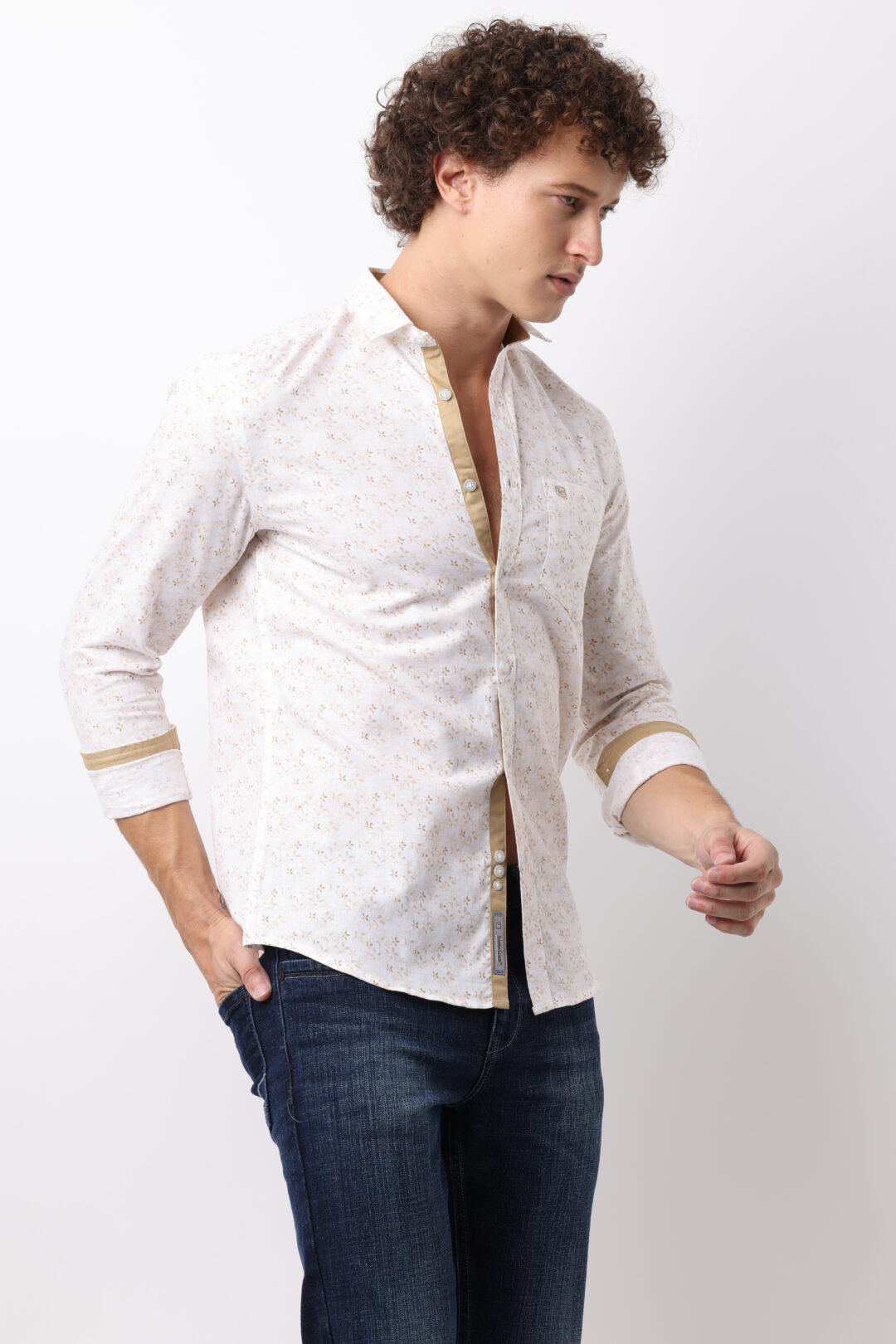 The men’s full sleeve camel flower print shirt pairs well with chinos or jeans, making it a versatile addition to your collection. Whether you’re heading to a business meeting or a casual outing, this shirt will ensure you stand out in style.