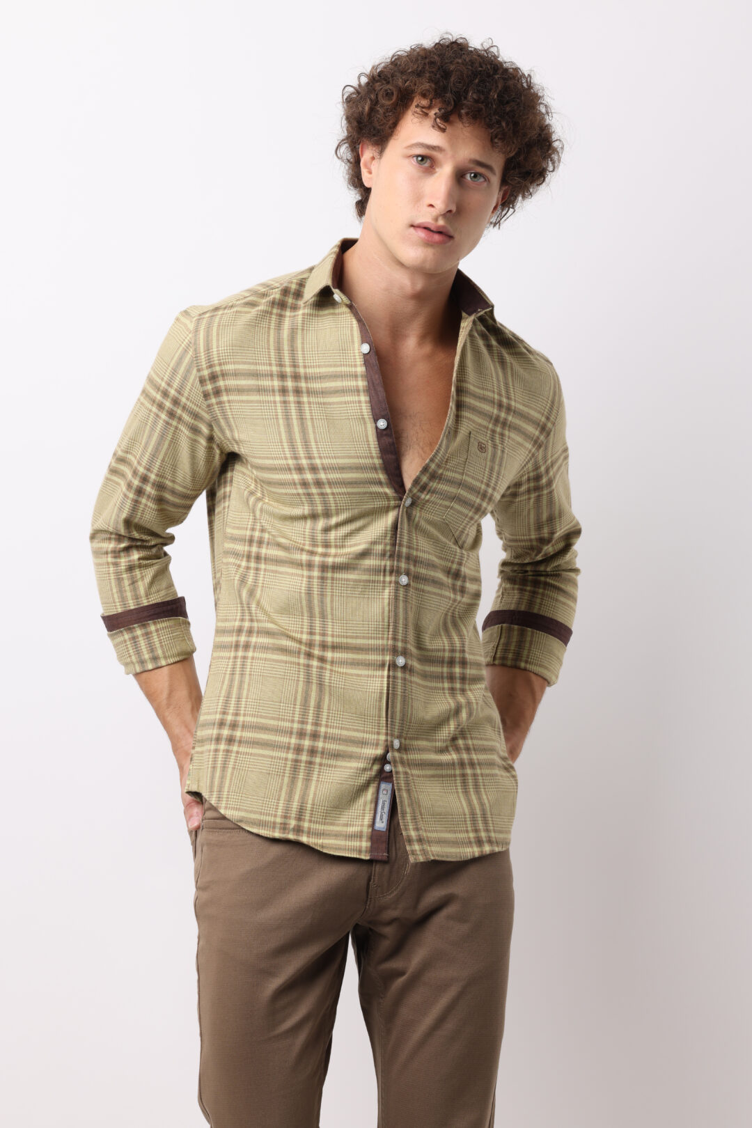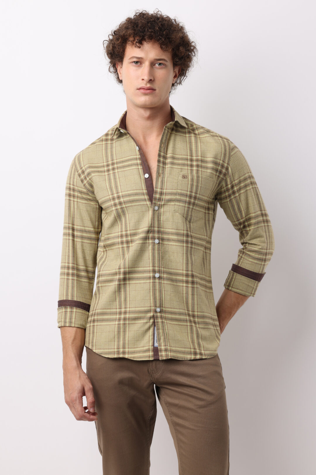 The emerald checks on a chestnut background allow this shirt to be effortlessly paired with jeans, chinos, or even tailored trousers. It’s easy to dress up or down, making it a perfect choice to showcase your unique fashion sense.