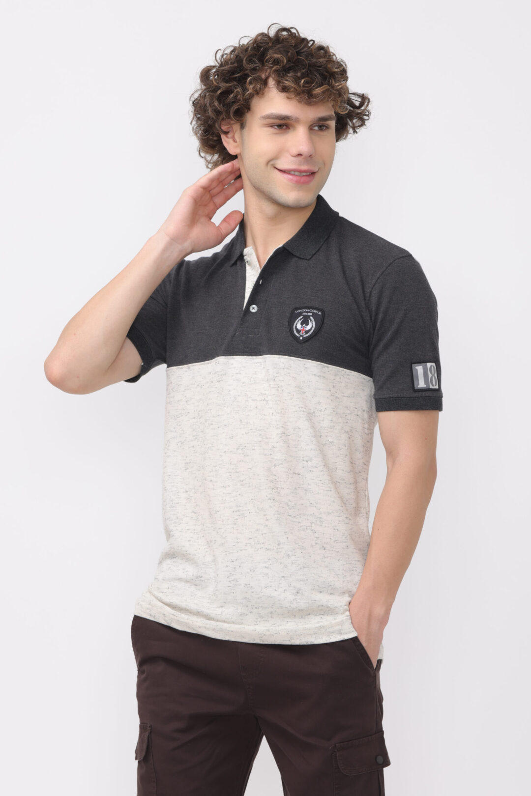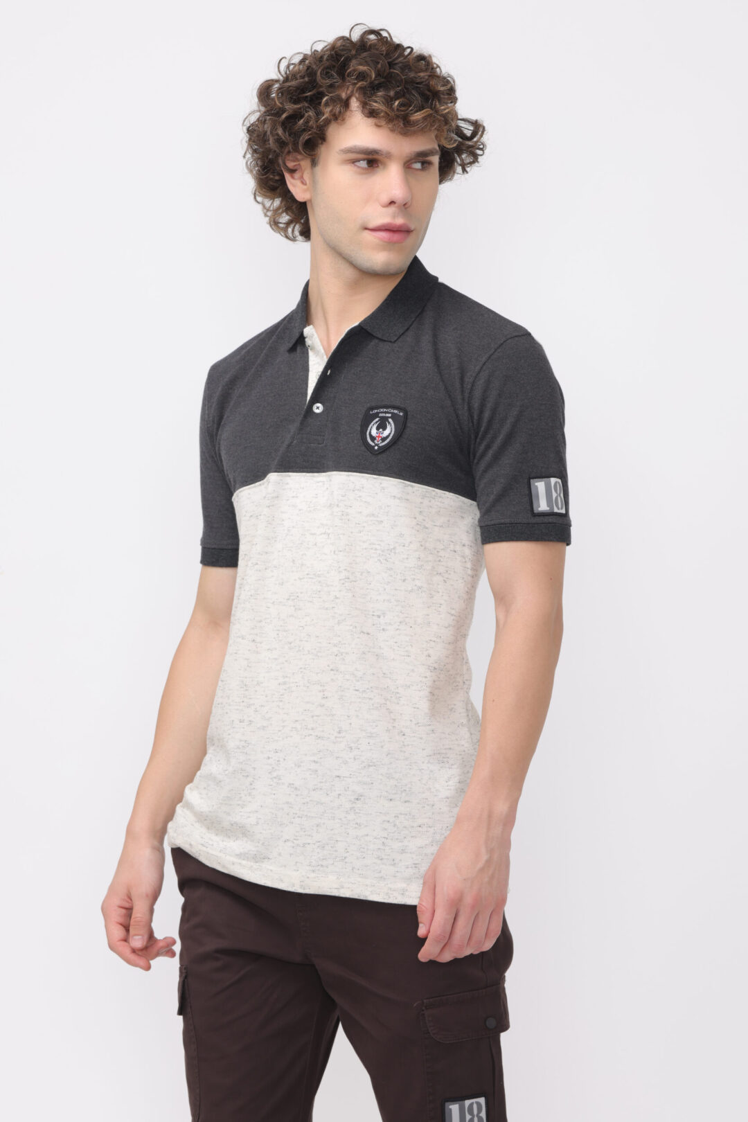 Crafted with precision, this polo tshirt features a suave charcoal panel sewn seamlessly into the ivory base. The quality materials ensure durability and comfort, providing a polished look for any casual or semi-formal occasion.
