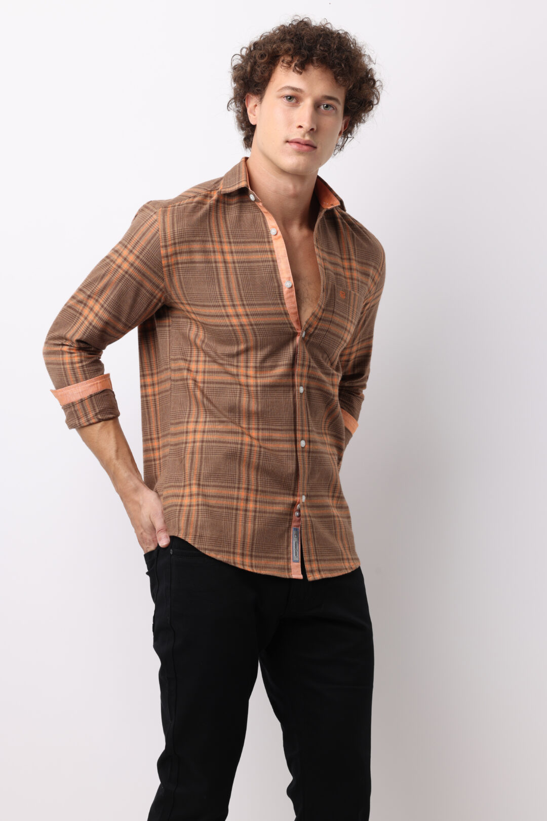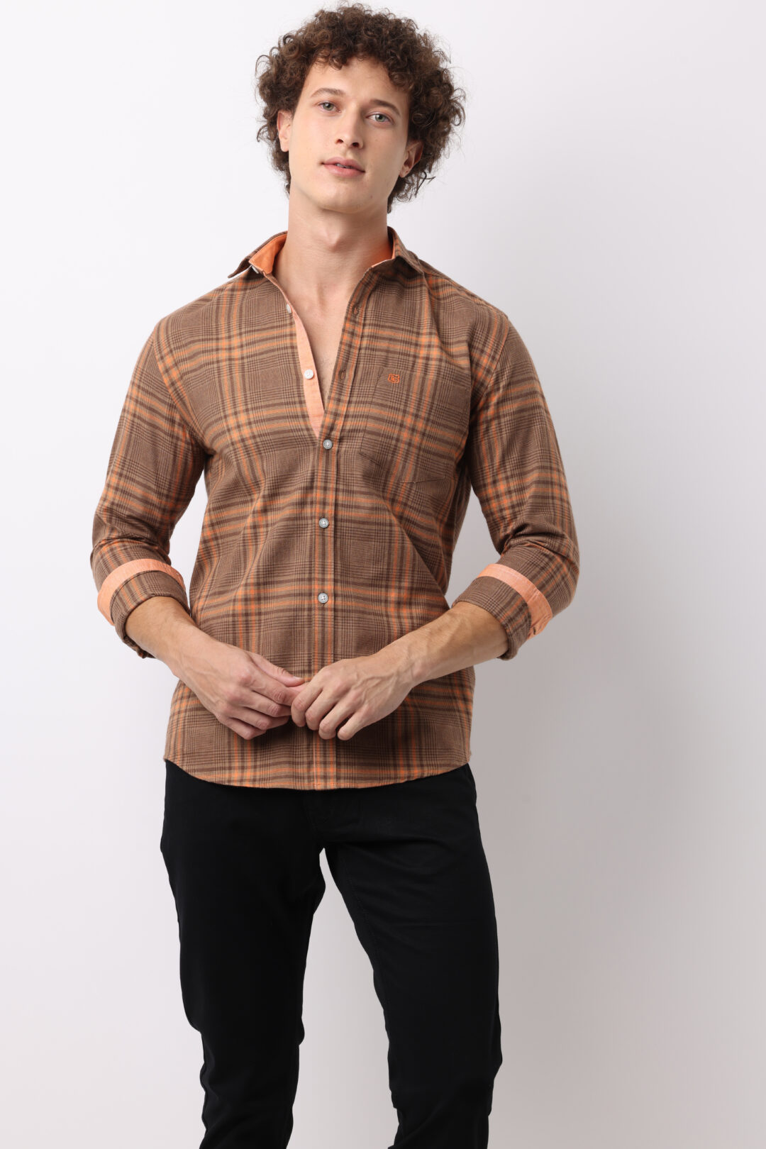 Introducing the men’s full sleeve plum grid cinnamon checks shirt, a versatile addition to your wardrobe. This shirt features an eye-catching grid pattern that combines style with sophistication, making it perfect for various occasions.